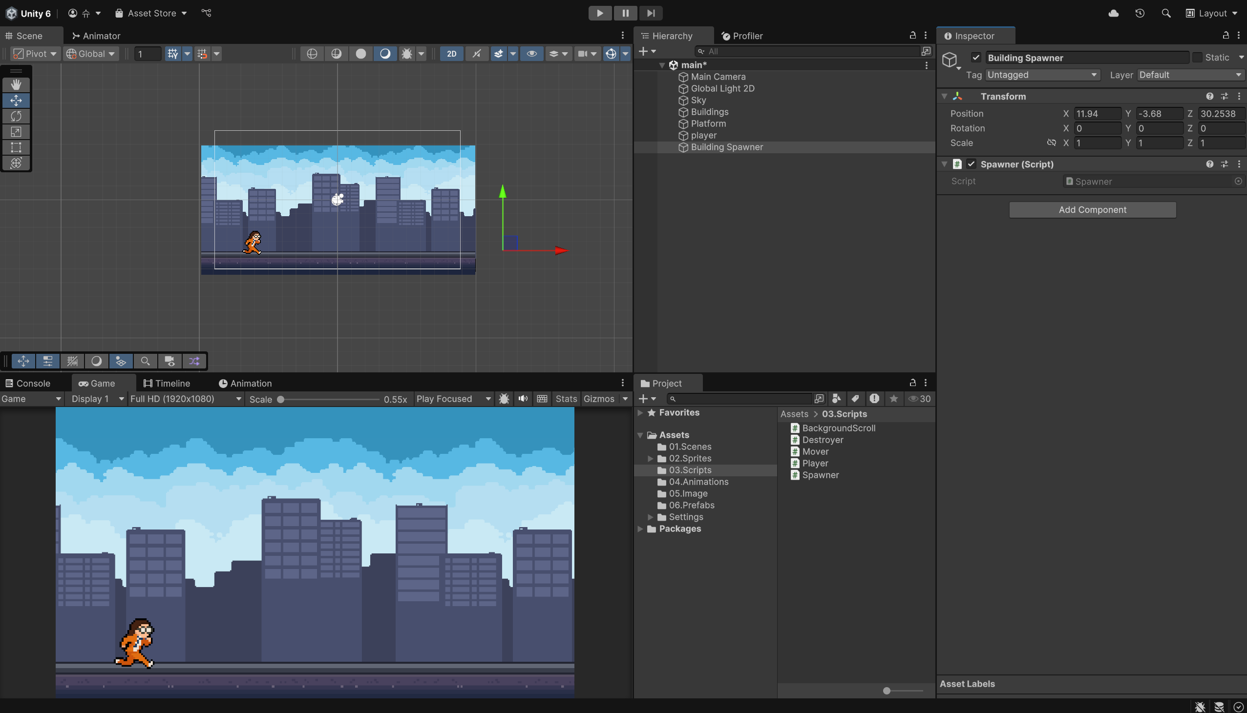 - 빌딩과 같은 움직이는 객체를 위한 Mover 스크립트와 화면에서 벗어나면 사라지는 Destroyer 스크립트를 생성하였습니다.