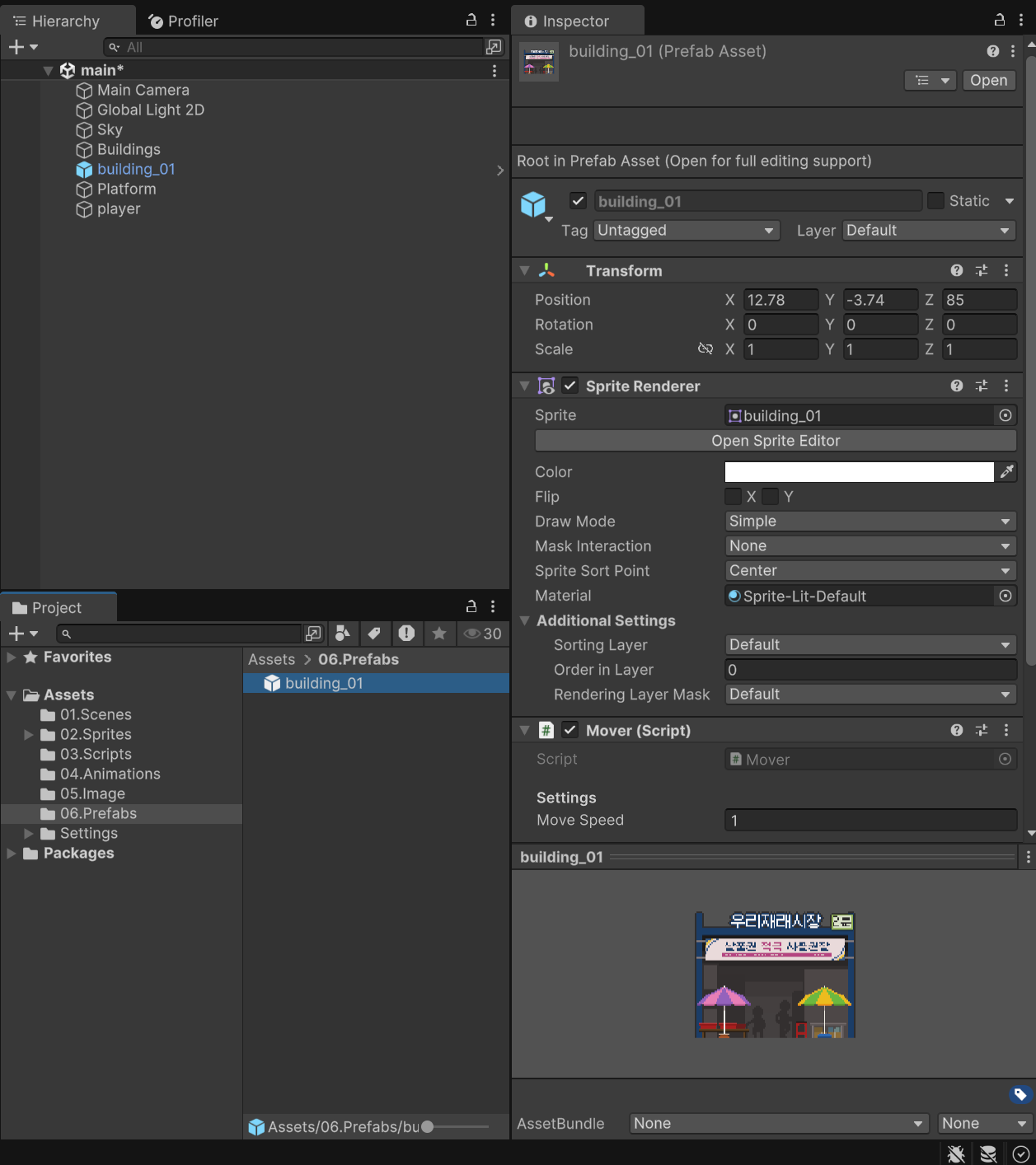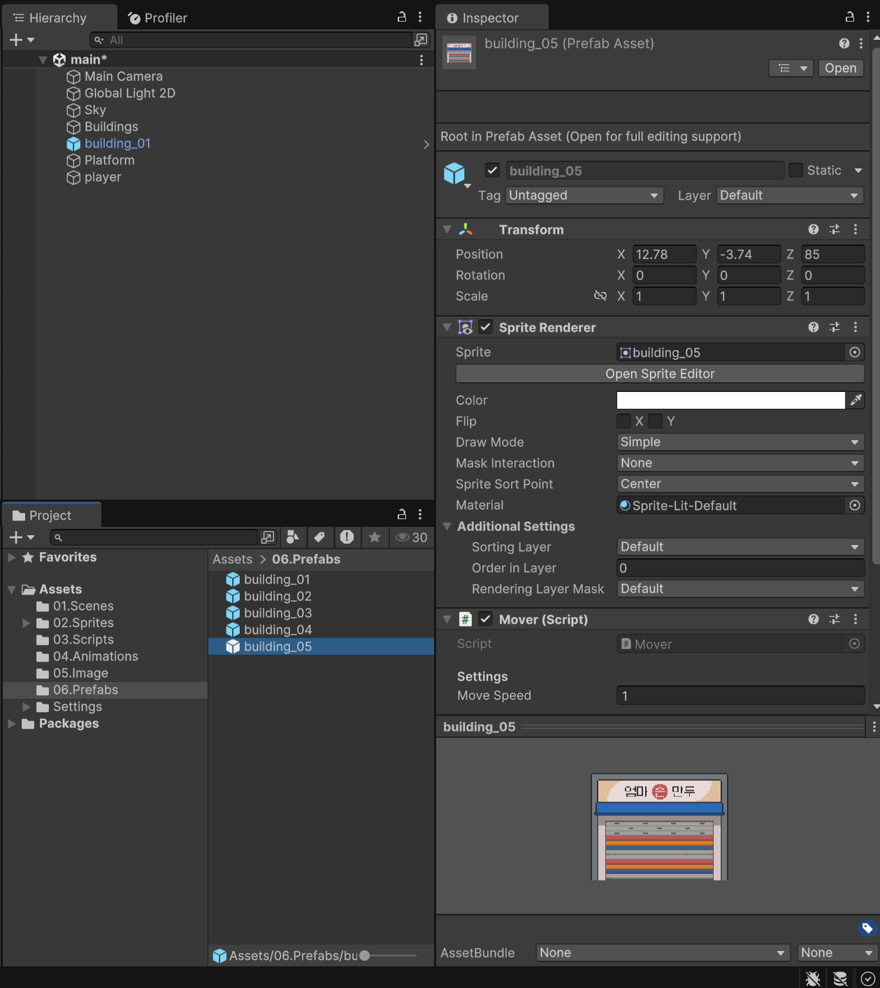 - 스프라이트의 빌딩은 중심축이 이미지의 중간으로 되어 있는데, 중심을 이미지 하단의 중간으로 맞춰주었습니다.