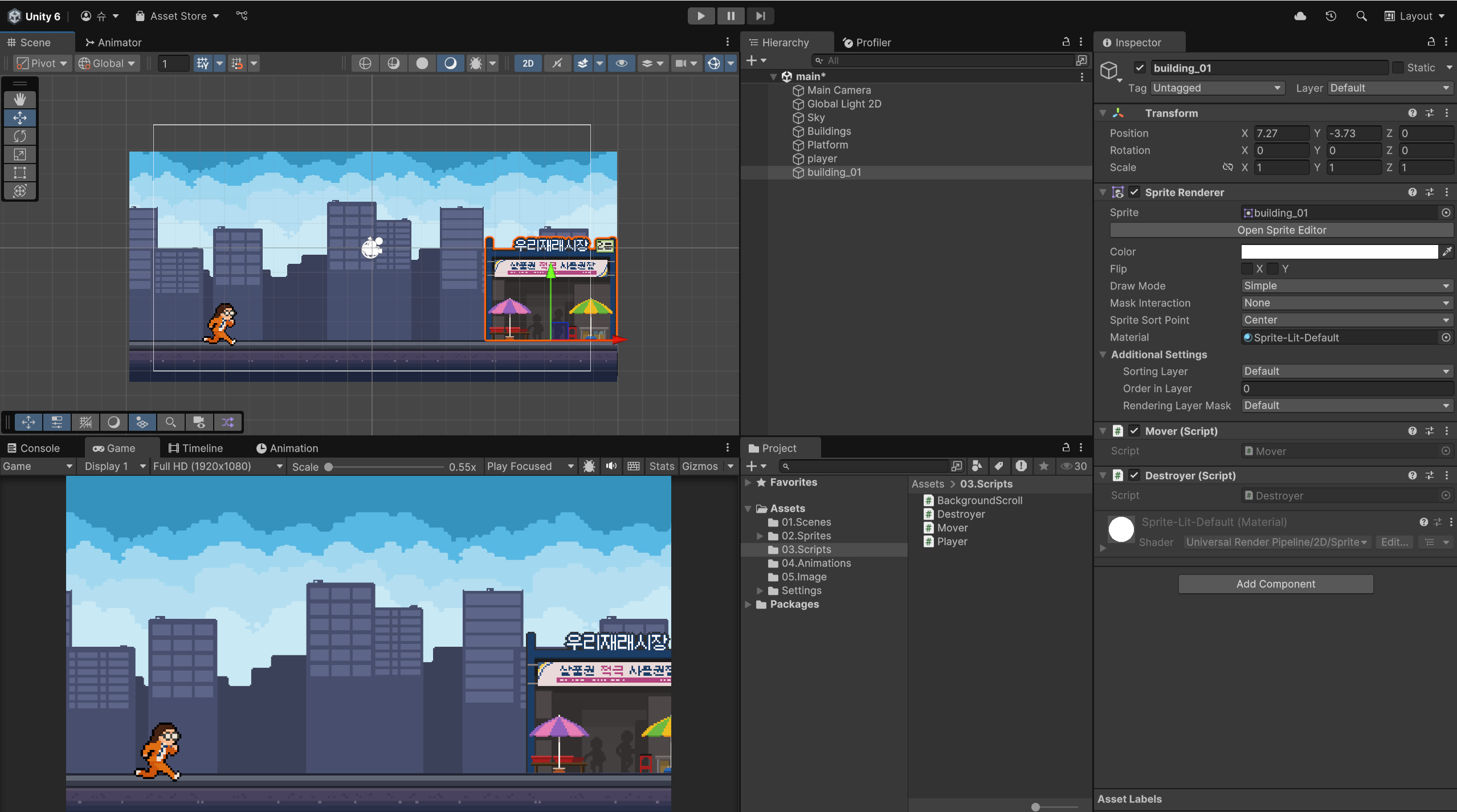 - 게임 화면에 스프라이트의 빌딩 건물을 배치시키고 비율에 맞춰서 크기를 변경하였습니다.